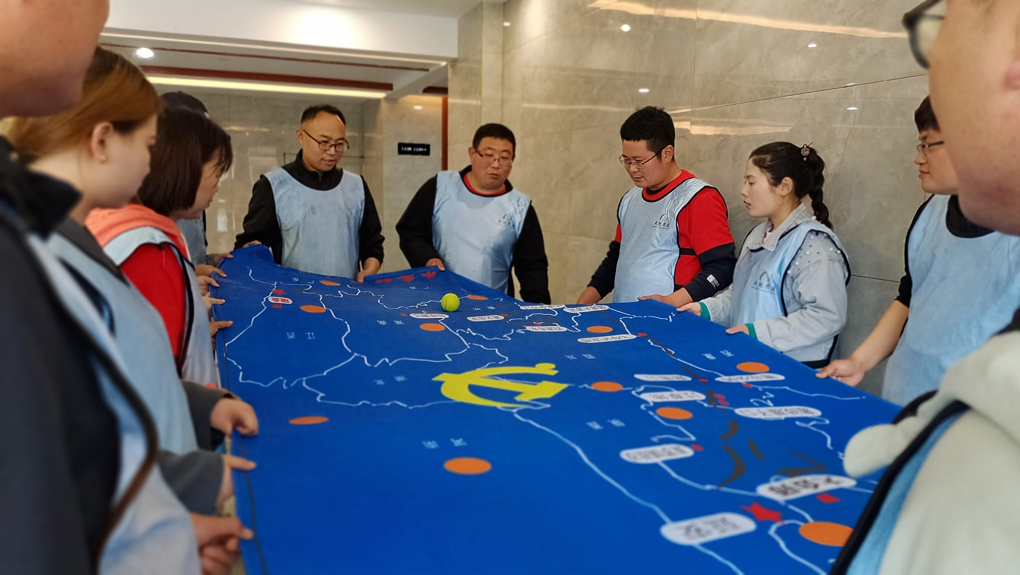 在“重走长征路”环节,大家在“中央红军长征路线图”的画布上放置代表中央红军的网球,以“瑞金”为起点,按长征路线“重走长征路”。大家用心感受中央红军艰苦长征之路,深入体会红军长征精神,齐心协力,携手合作,共渡难关,全部达成任务目标。