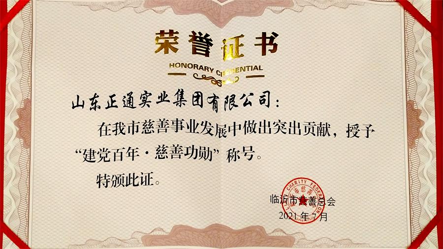 日前,山东正通实业集团有限公司获得临沂市慈善总会“建党百年·慈善功勋”荣誉称号。